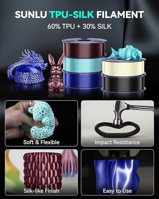 Sunlu TPU Silk Rigid & Flexible filament offers a unique blend of elasticity and precision, making it ideal for a variety of 3D printing applications. Designed for near-end and distal extrusion methods, it provides speed recommendations for optimal results. Slicing settings can be tailored for enhanced softness or elasticity by adjusting wall thickness and infill percentages. Cooling and curing times accommodate larger model sizes, while certain structures, such as high overhangs, are better avoided. This filament is perfect for crafting durable, flexible parts, ensuring reliable performance with smooth, precise finishes, even on complex models.